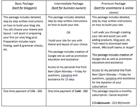 I’ve been contacted a few times about how I’ve created my website. I am now happy to announce that I’ve began to help others create and design their blogs, online stores, and business sites! To the right you’ll find the current available packages to help meet your needs! If interested, email me to receive a FREE consultation! Hope to her from you soon!